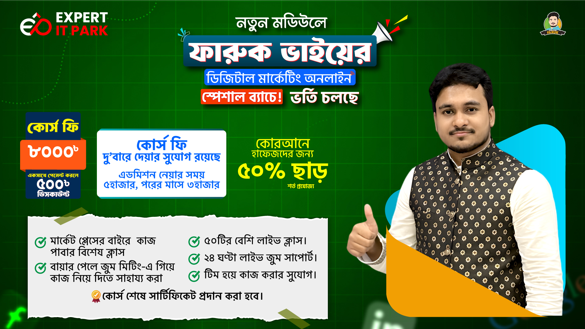 ডিজিটাল মার্কেটিং, গ্রাফিক ডিজাইন, ভিডিও এডিটিং সব প্রফেশনাল কোর্স এক জায়গায়। নিজের সময়ে শিখুন, নিজের ক্যারিয়ার গড়ুন। ExpertitPark Academy এ স্বাগতম।